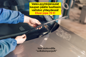 Saat kaupan päälle laadukkaat Valeo-pyyhkijänsulat, kun tuot autosi meille tuulilasin vaihtoon (sulkien arvo jopa 70 euroa). Kampanja on voimassa 2.4.2026 asti ja koskee vain uusia varauksia. Etu ei koske mallikohtaisia erikoissulkia eikä takasulkia. Edun saat mainitsemalla etukoodin ”sulkakampanja26” varauksen yhteydessä. Etua ei voi yhdistää muihin tarjouksiin. Voit soittaa meille puh. 045 872 3934 / Tampereen Autolasipalvelu tai varata aikasi tuulilasin vaihtoon 24h nettiajanvarauksestamme, jonne voit syöttää suoraan etukoodin kampanjakoodikohtaan. Lisätietoja Tampereen Autolasipalvelun sivuilta.